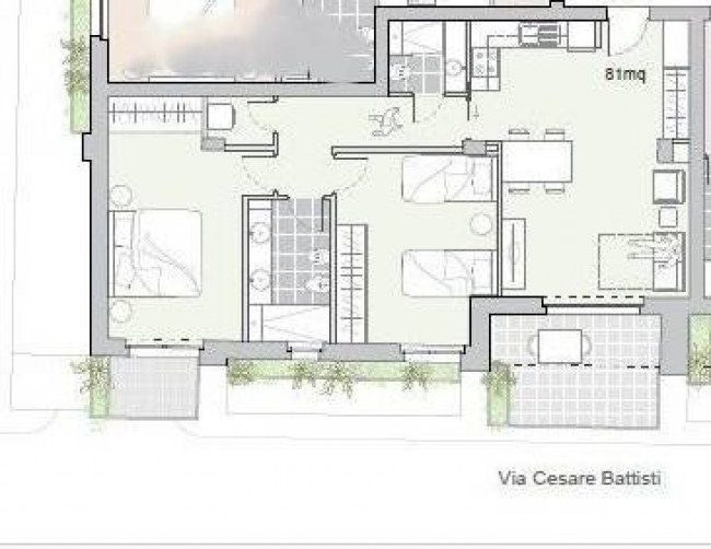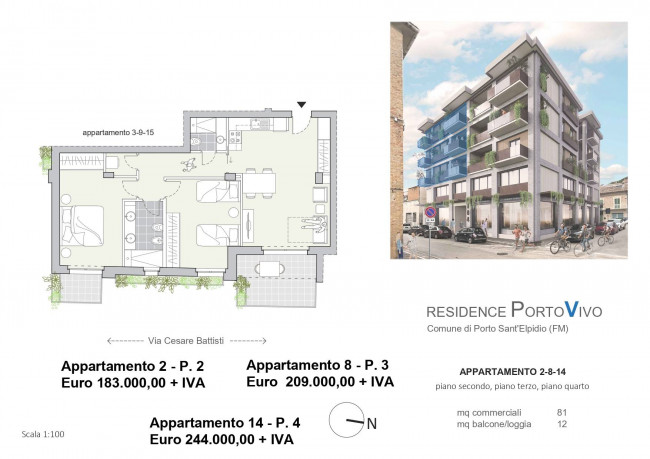 ESEMPIO (TRILOCALE - Piano 2) Appartamento 2 Superficie Mq.81 + loggia mq.12 Soluzione composta da: ingresso, soggiorno con angolo cottura e zona pranzo, 2 camere da letto, doppi servizi. Doppia esposizione (Sud/Est). Posti auto da computare con prezzo a parte.