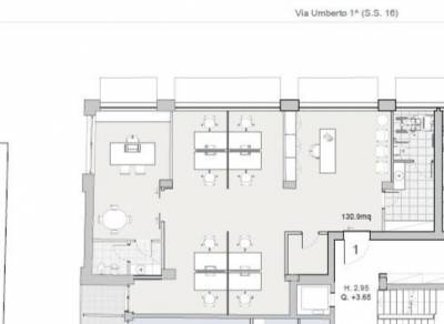 Mq. 131 + balcone Mq. 3 Soluzione composta da ingresso, area reception, doppia postazione di lavoro, zona riunioni, bagno.